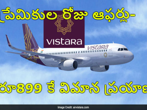 ప్రేమికుల రోజు సందర్భంగా సింగపూర్ ఎయిర్లైన్స్ (సియా) భాగస్వామ్యంలో ఏర్పాటైన ఎయిర్లైన్స్ సంస్థ విస్తారా ప్రయాణికులను ఆకర్షించే సరికొత్త పథకాన్ని ప్రారంభించింది. ఇందులో భాగంగా 899 రూపాయల ప్రారంభ ధరతోనే వివిధ గమ్యస్థానాలకు ఎకానమీ టికెట్ను ఆఫర్ చేస్తోంది. ఇంకా ఆ సంస్థ అందించిన పలు ఆఫర్ల విశేషాలను తెలుసుకుందాం.