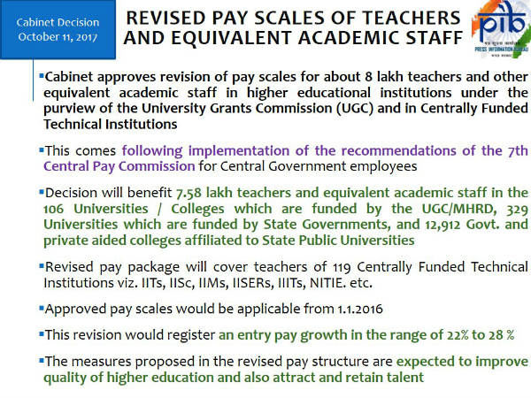 7వ వేతన సవరణ సంఘం ఇచ్చిన సిఫార్సులపై ప్రధాని నరేంద్ర మోదీ నేతృత్వంలో బుధవారం మంత్రివర్గ సమావేశం జరిగింది. ఈ సమావేశంలోనే పే కమిషన్ సిఫార్సులను మంత్రివర్గం ఆమోదించినట్లు ఆయన తెలిపారు. కేంద్రప్రభుత్వ ఆధీనంలో పనిచేస్తున్న యూనివర్సిటీ అధ్యాపకులకు, యూనియన్ గ్రాంట్స్ కమిషన్ పరిధిలో ఉన్న వర్సిటీలు, కేంద్ర ప్రభుత్వం ఆధీనంలోని సాంకేతిక, ఇతర ఉన్న విద్యాలయాల్లో పనిచేస్తున్న లెక్చరర్లు, టీచర్లకు ఈ పెంపు వర్తిస్తుందని ఆయన చెప్పారు.