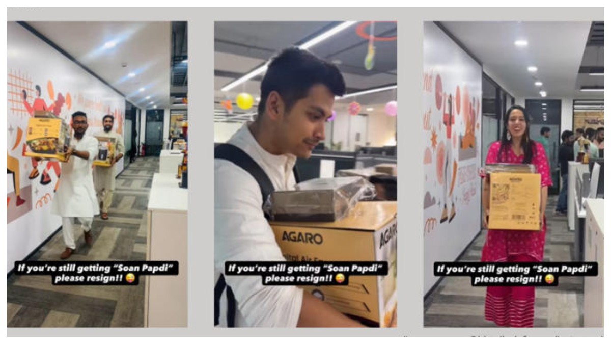 బ్యాంక్లు, IT కంపెనీలు మరియు ఇతర పెద్ద సంస్థలు ఈ దీపావళి సందర్భంగా ఉద్యోగులకు గిఫ్ట్స్ ఇచ్చి ఆనందాన్ని పంచుతున్నాయి. ఇన్స్టాగ్రామ్లో వైరల్ అయిన వీడియోలో ఉద్యోగులు సంప్రదాయ దుస్తుల్లో, గర్వంగా తమ గిఫ్ట్స్ ఒక ఎయిర్ ఫ్రైయర్ మరియు చిన్న బాక్స్ తో కనిపించారు. వీడియో క్యాప్షన్ ఇలా ఉంది - "మీకు ఇంకా 'సోన్ పాప్డీ'' వస్తున్నట్లయితే, రిజైన్ చేయండి". ఇది సోషల్ మీడియాలో పెద్ద హాస్య వ్యంగ్యాన్ని దారితీసింది.