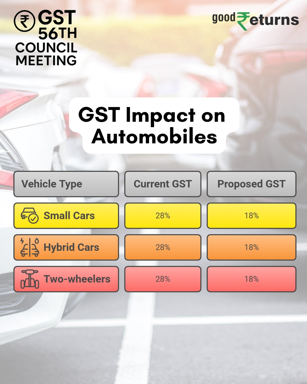 వాహనాలకు వస్తు సేవల పన్ను (GST) రేట్లు గతంలో 28-31% మరియు 43-50% రేట్ల నుండి 18% మరియు 40% కొత్త రేట్లకు తగ్గించబడ్డాయి. ఈ సర్దుబాటు వాహన కొనుగోలుదారులకు గణనీయమైన ఖర్చు ఆదాకు దారితీస్తుందని మరియు ఆటోమొబైల్ రంగంలో వృద్ధిని ప్రేరేపిస్తుందని భావిస్తున్నారు.