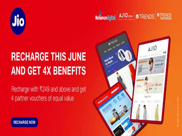 రిలయన్స్ జియో మరో అద్భుత ఆఫర్తో ముందుకు వచ్చింది. తమ కస్టమర్లకు నాలుగు రెట్ల (4x) బెనిఫిట్స్ అందించే సరికొత్త రీచార్జ్ ప్రకటన చేసింది. రిలయన్స్ డిజిటల్, ట్రెండ్స్, ట్రెండ్స్ ఫుట్వేర్, అజియోతో కలిసి ప్రయోజనం అందించనున్నట్లు తెలిపింది. 2016లో ప్రారంభమైన జియో నాలుగేళ్లలోనే అత్యధిక కస్టమర్లను సంపాదించుకొని, కొత్త కొత్త ఆఫర్స్తో ముందుకెళ్తోంది.